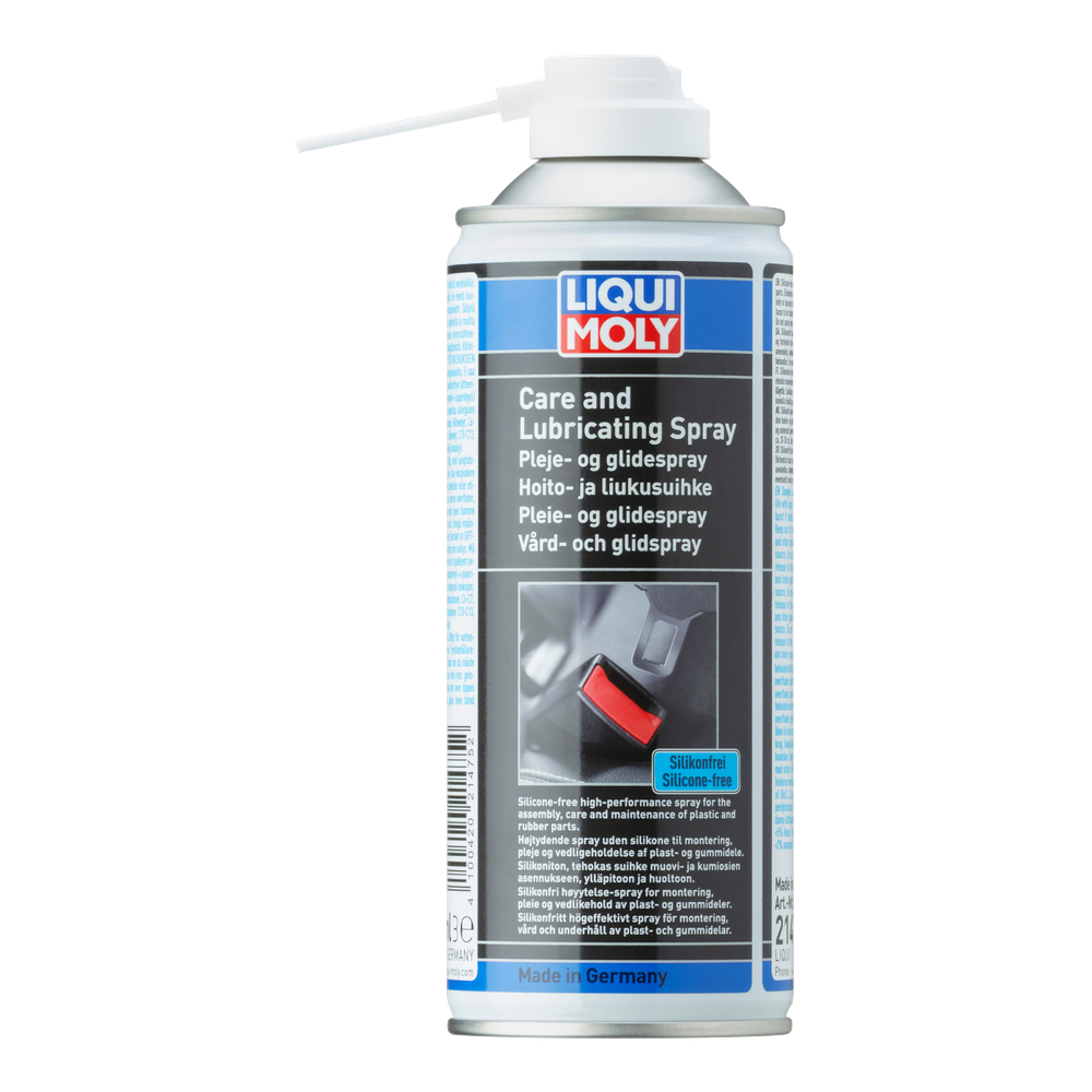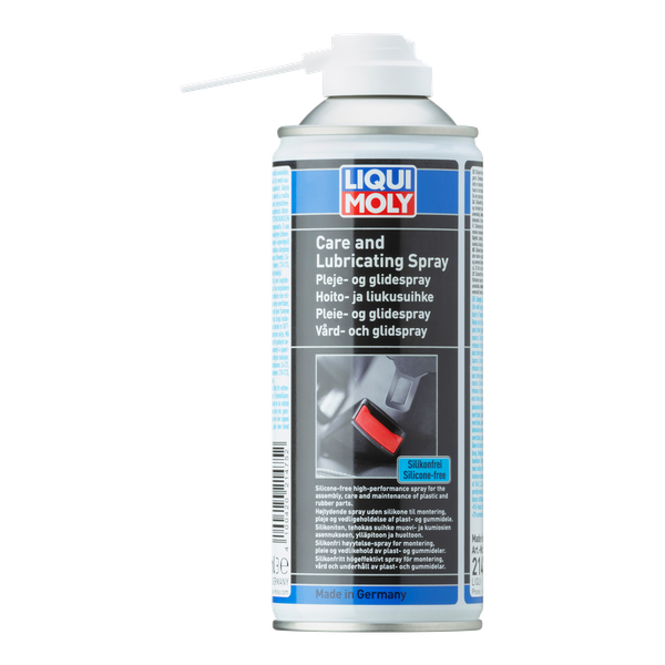 Silicone-free care and lubricating spray for the lubrication, assembly and maintenance of plastic and rubber parts. Ideally suited for paint-sensitive areas. Eliminates and prevents rattling and squeaking noises, particularly between plastic parts. Expels water and moisture, does not resinify or become sticky. Transparent and for universal use.
